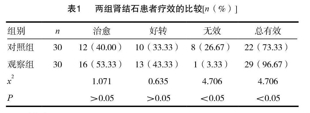对照组,对照组采用体外冲击波碎石,观察组采用体外冲击波碎石联合排石颗粒治疗。 结果 观察组总有效率为96.67%,高于对照组的总有效率73.33%,差异有统计学意义(P<0.05)。 结论 体外冲击波碎石联合排石颗粒治疗肾结石疗效可靠。
